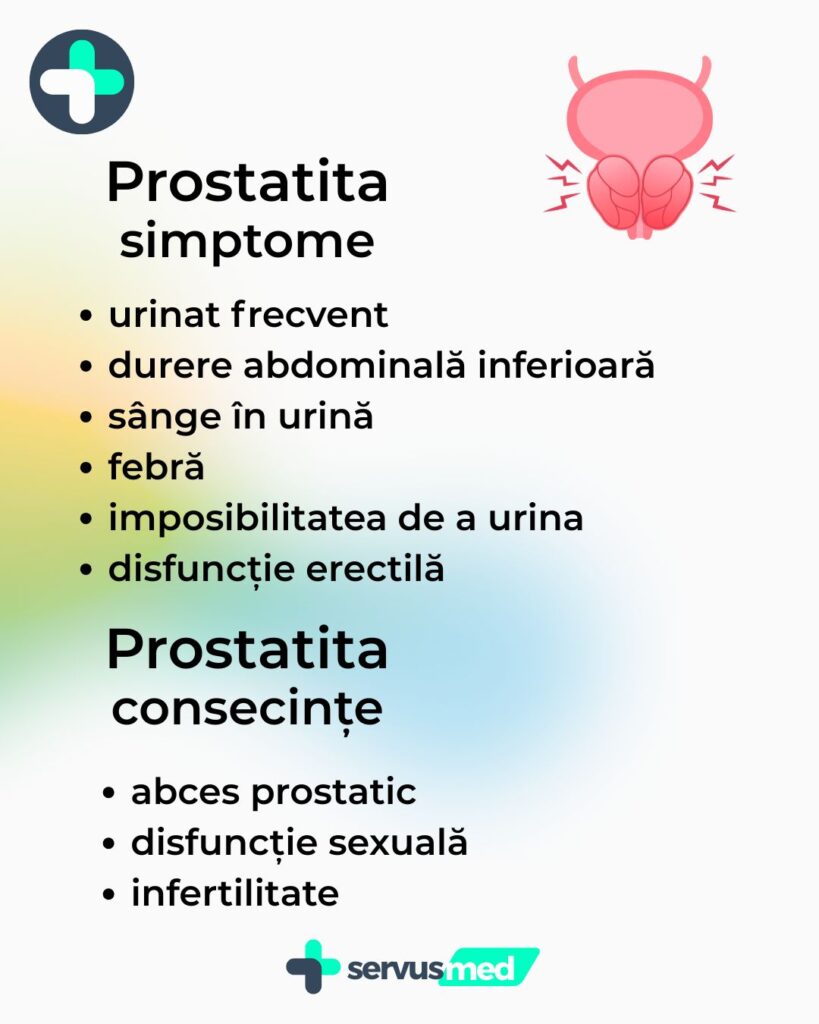 - ejaculare dureroasă, durere pelvină după contact sexual, probleme sexuale (disfuncție erectilă) – în special în prostatita cronică